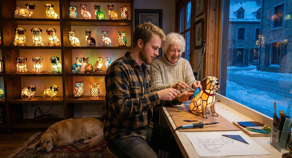 Bonjour, je suis Liam. Ceci est la dernière collection d'art de ma Grand-mère Emilie, qui a consacré sa vie à créer ces lampes uniques, inspirées principalement par les animaux qu'elle a secourus.